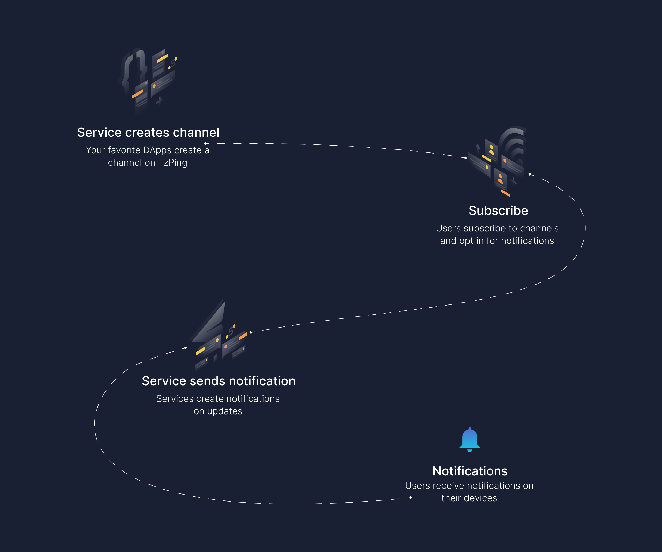 TzPing is a blockchain protocol that provides you decentralized notifications from different DApps and channels.